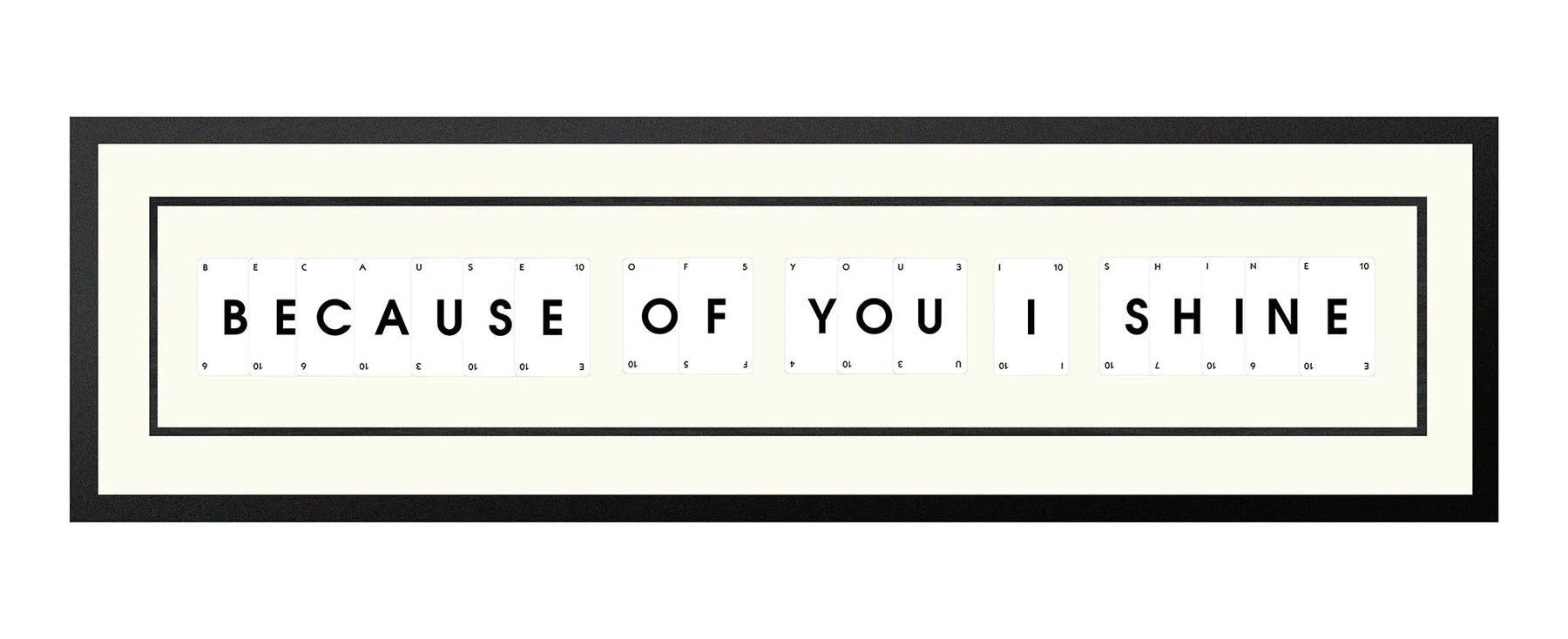 Handmade playing card picture frame spelling 'Because Of You I Shine' – framed quote wall art made in the UK.