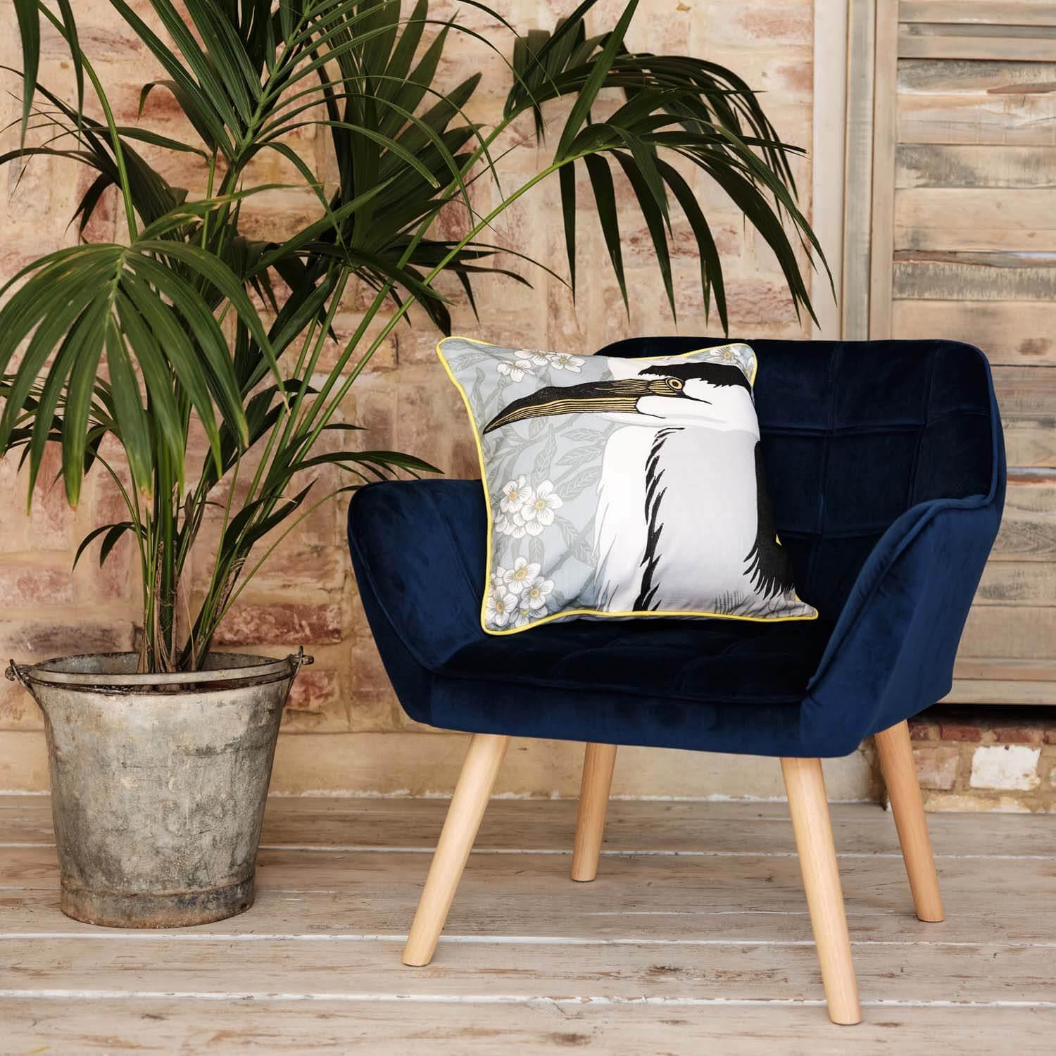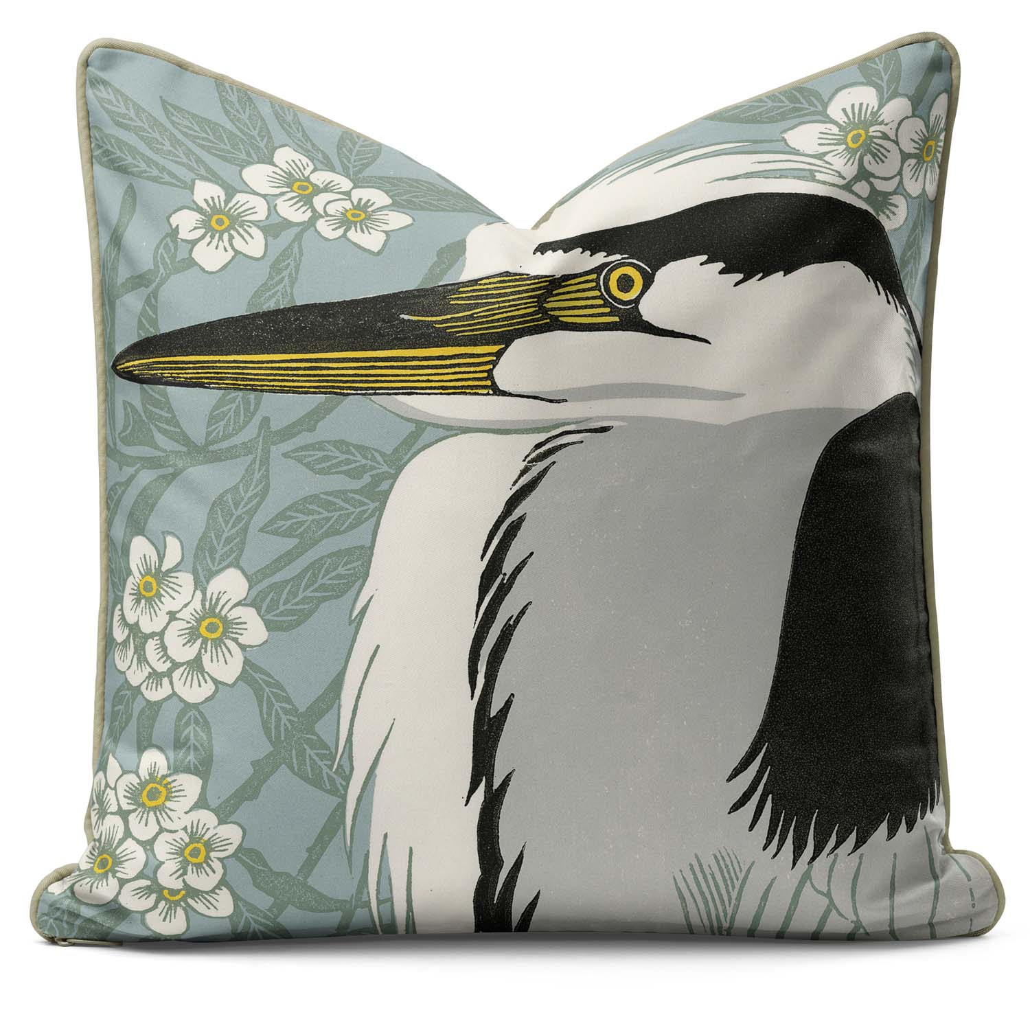 A piped cushion with a picture of a bittern on. Small flowers in the background.