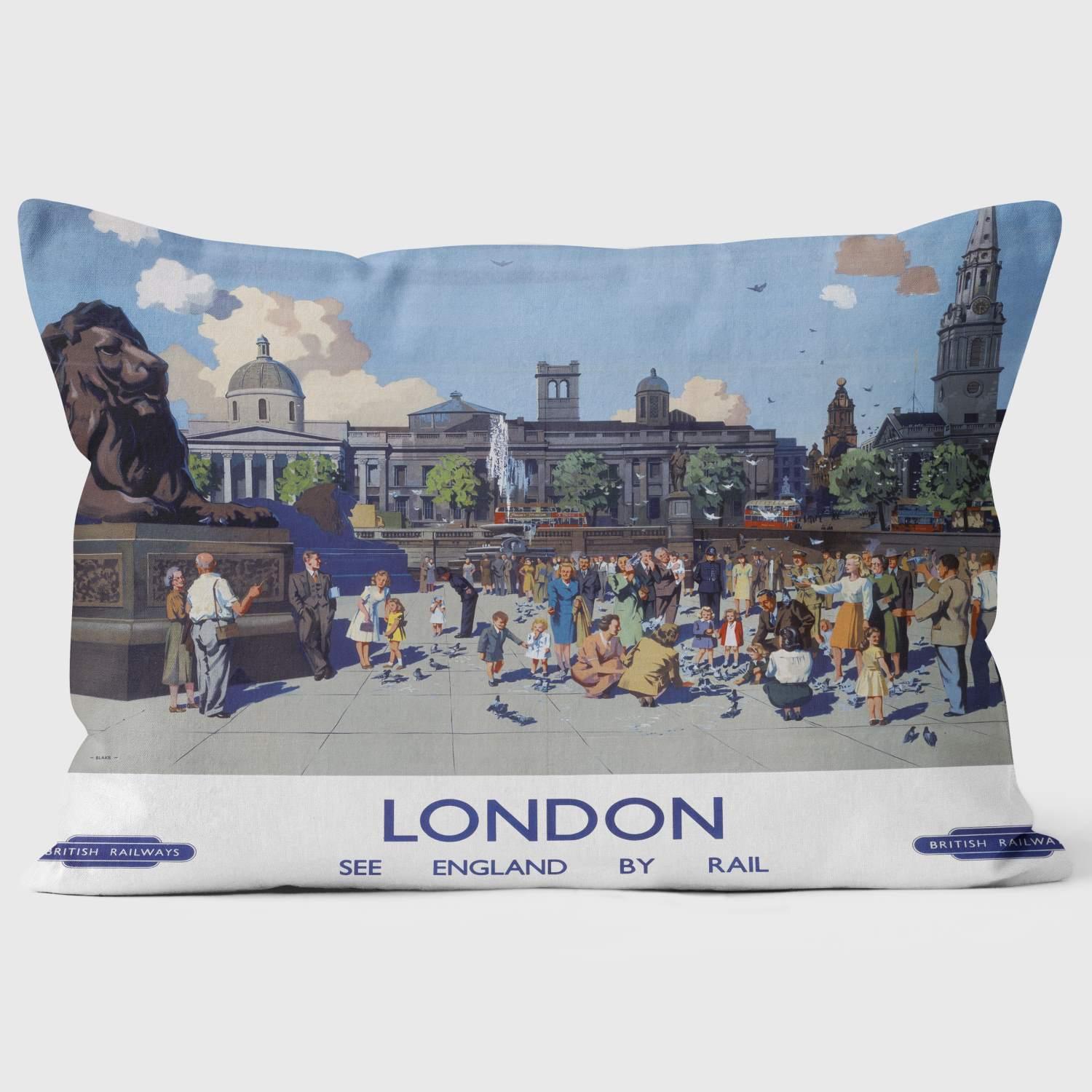 Produced for British Railways (BR) to promote rail services to London. The cushion shows a view of Trafalgar Square, with crowds feeding the pigeons and the Natonal Gallery and St Martin-in-the-Fields visible in the background. Artwork by F Donald Blake.