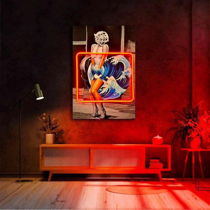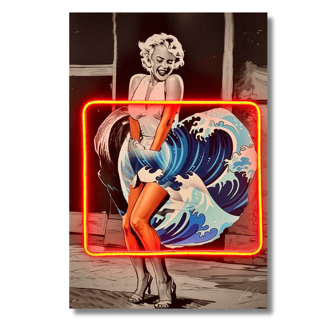 Dive into a wave of iconic fusion with the "Marilyn & Kanagawa" LED Wall Art. This masterpiece blends the timeless elegance of Marilyn Monroe’s iconic dress moment with the legendary Great Wave off Kanagawa, seamlessly merging pop culture and classical art. Enhanced by vibrant LED accents, this piece is a bold and dynamic celebration of beauty, power, and the unexpected. Perfect for art lovers with a taste for the extraordinary.