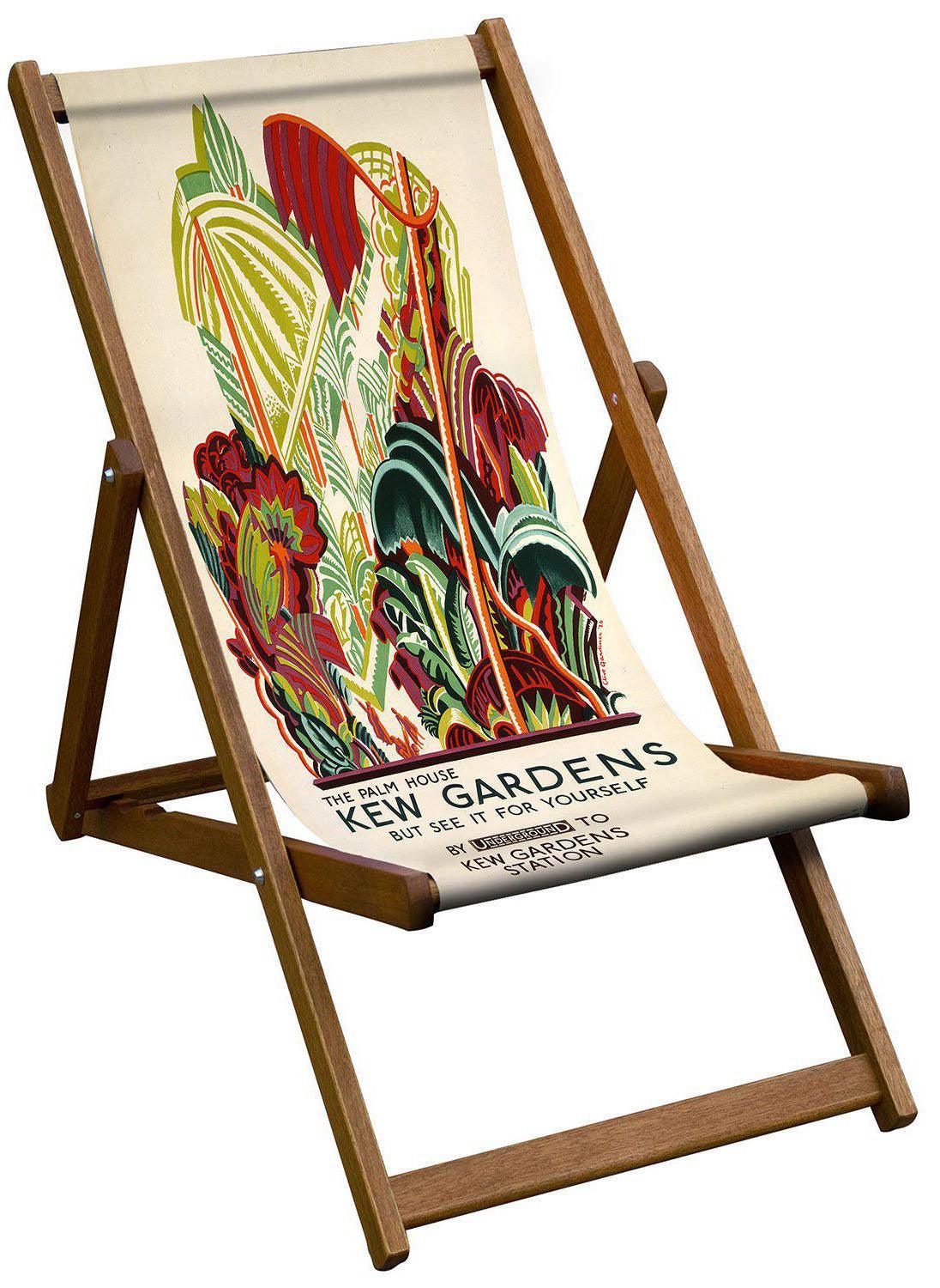 This stylish deck chair from London Transport Museum Poster Archive features the poster; The Palm House - Kew Gardens, by Clive Gardiner, 1926.The frame is made in UK from FSC Beech Hardwood oil soaked and the sling from hard wearing polyester canvas, providing a durable print and excellent protection in all weather conditions.