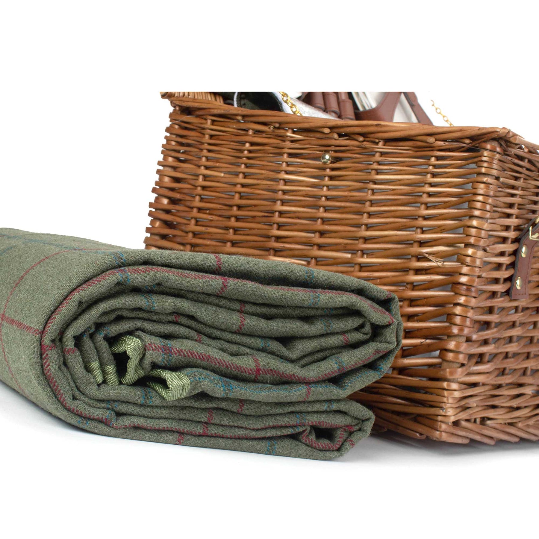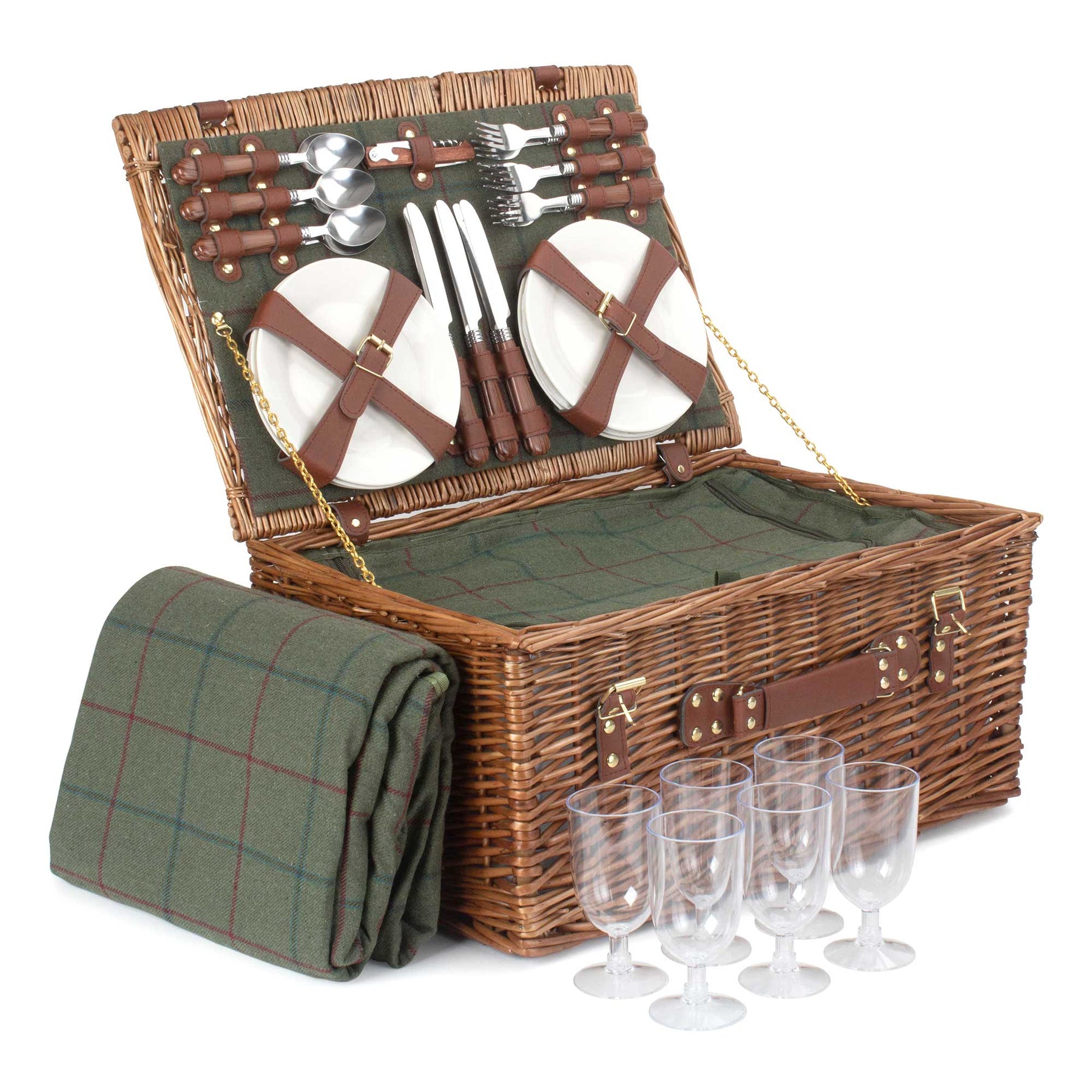 Elevate your outdoor dining experience with this luxurious 6-person picnic hamper, beautifully crafted in a classic green tweed design. Hand-woven from full light-steamed willow and finished with tan faux-leather straps and fittings, this hamper delivers effortless style and practicality for countryside adventures, beach outings, garden barbecues or relaxed alfresco dining.