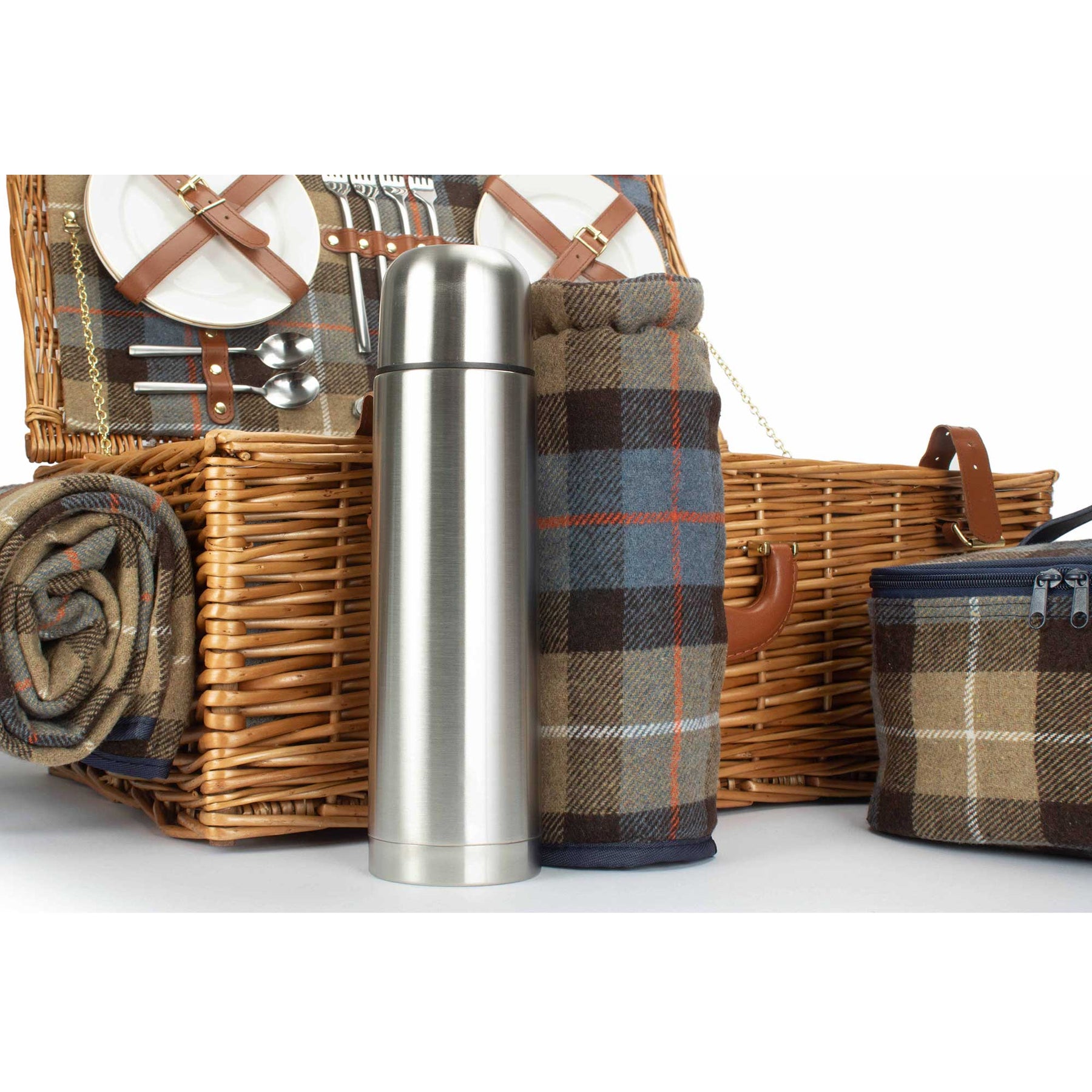 Everything inside has its place. The gold-rimmed porcelain plates, wine glasses and stainless steel mugs sit neatly in their own secured sections, while the cutlery and napkins are strapped in ready to go. The hamper comes fully equipped with thoughtful extras — a wine opener, salt and pepper shaker, a bottle duffle, a generous tartan picnic rug and a matching cooler bag to keep food and drinks fresh throughout the day. There’s even a 750ml flask for warm drinks or soups.