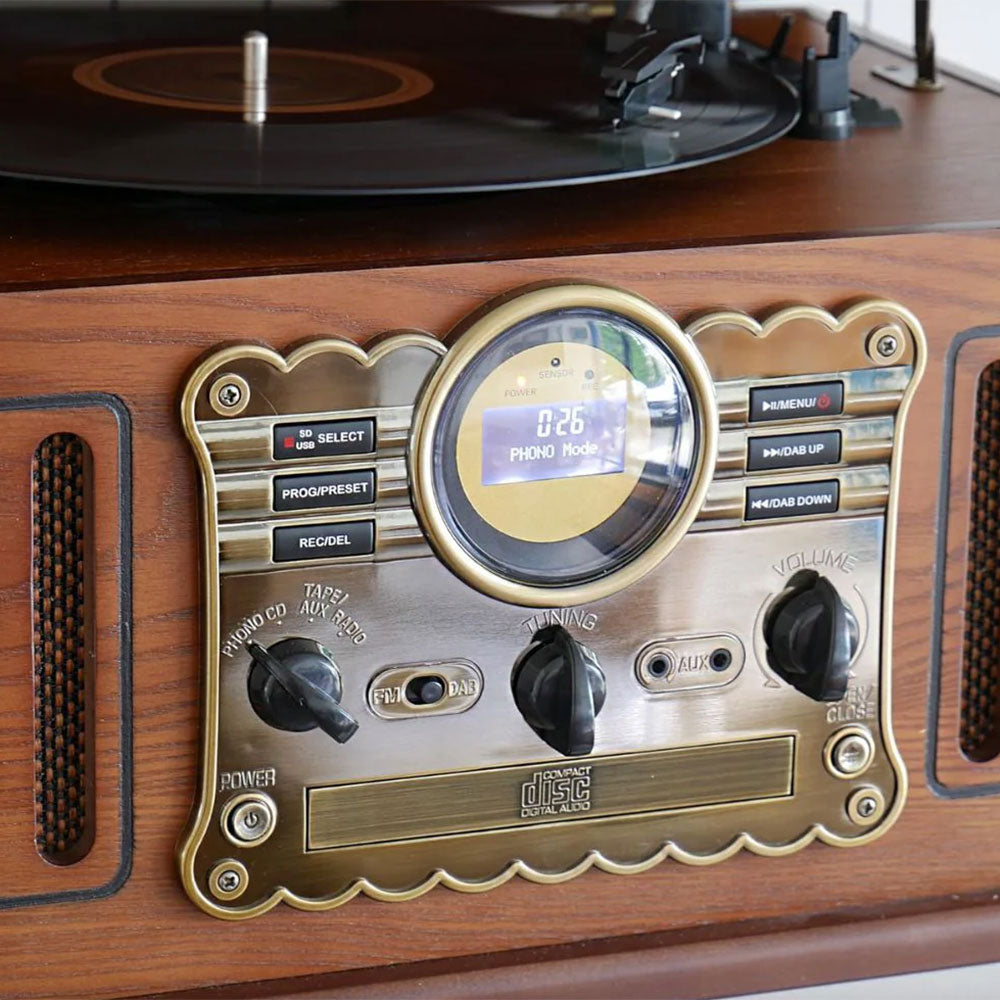 Rediscover your entire music collection with the Steepletone Westminster DAB 7-in-1 Bluetooth Music Centre, a beautifully crafted retro hi-fi system that combines classic design with modern convenience. Finished in elegant dark wood, this all-in-one record player plays vinyl, CDs, cassette tapes, radio and digital music through powerful built-in stereo speakers.