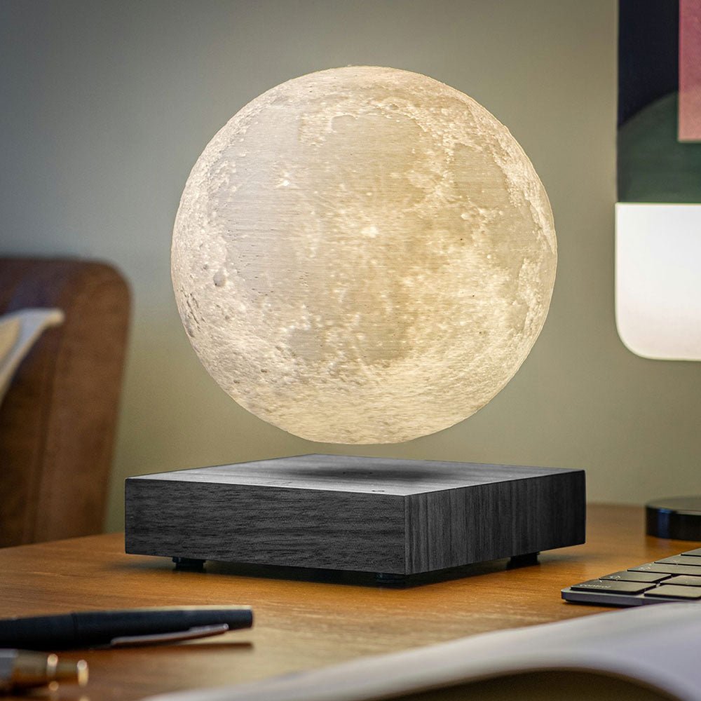 Let your home become a satellite of sophistication with the Gingko levitating and floating Moon Table Lamp, a unique table lamp that has an illuminating moon that gracefully hovers and spins in midair above the stylish black wooden base. Its luxury design seamlessly blends modern technology with a timeless beauty, creating a truly captivating light and atmosphere. Illuminate your living space in style with this luxurious levitating and floating moon lamp by Gingko.