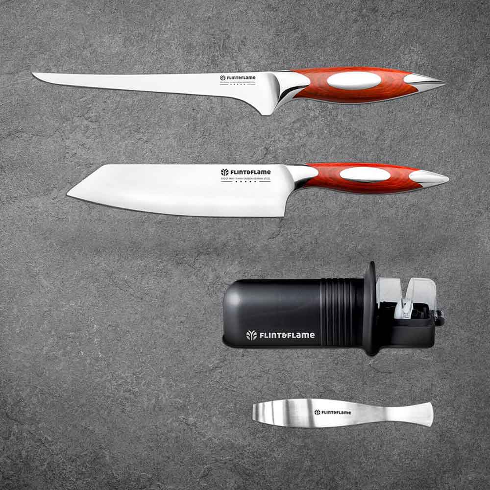 A very useful, practical set of professional kitchen knives from Flint and Flame, perfect for preparing fish.
