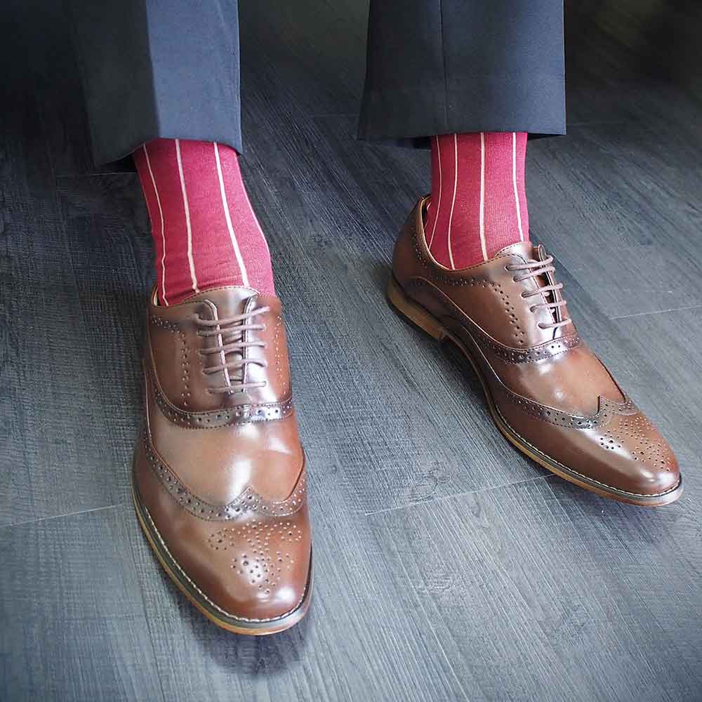 Introducing the Crimson Pin Stripe luxury men's socks. These sumptuous cream striped men's socks feature a complementing burnt orange heel and toe, with contrasting cream vertical stripes. These dazzling cotton socks embody the quirkiness that is 100% Peper Harow.