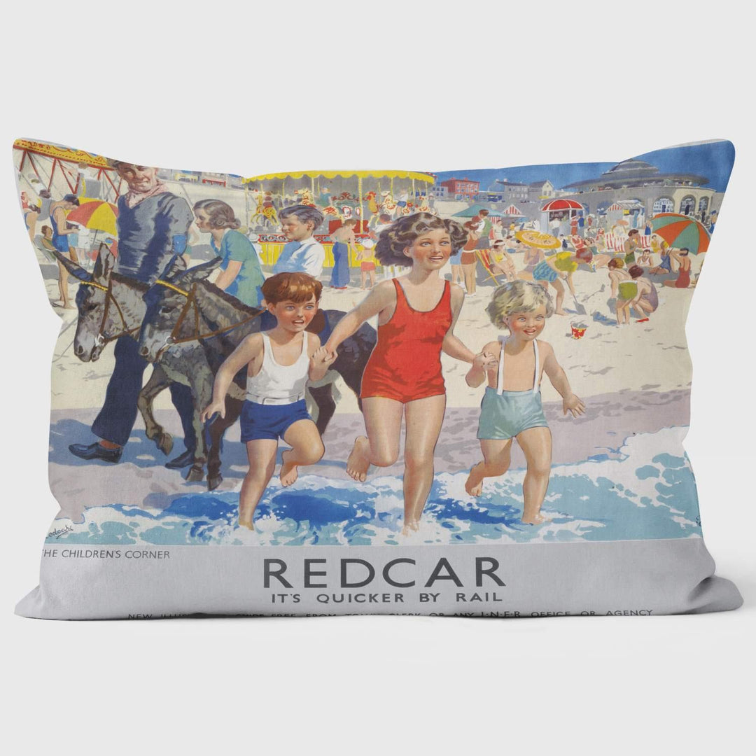 Produced for the London & North Eastern Railway (LNER) to promote rail travel to the popular North Sea coastal resort of Redcar. The cushion shows the attractions of 'Children's Corner'. Here, children are shown on funfair rides, paddling, riding donkeys and playing in the sand. Artwork by E Oakdale.