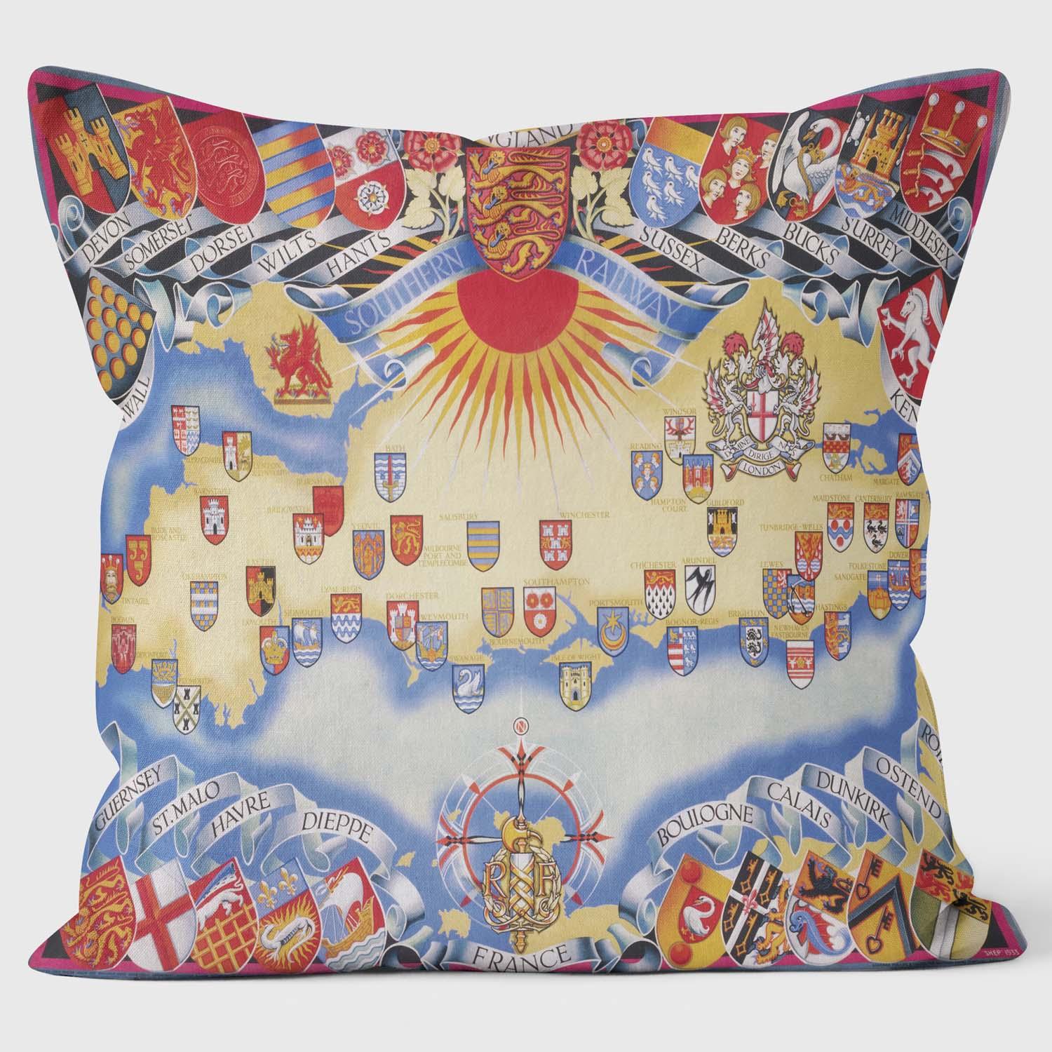 It produced for the Southern Railway (SR), showing a map of the southern coastline of Britain, with coats of arms representing the counties and major towns of the area. Artwork by Charles 'Shep' Shepherd (b 1892).
